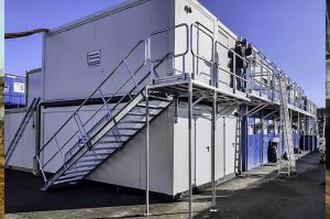 Schody kontenerowe zapewniają bezpieczny dostęp do pomieszczeń budowlanych, w których zorganizowane są biura i pokoje socjalne, a których piętrowe umiejscowienie wymaga wykorzystania schodów. System wykonano z w pełni bezpiecznych materiałów odpornych na zmienne warunki atmosferyczne i termiczne. Schody kontenerowe można ustawiać w różnej konfiguracji. Dostępne w wielu wariantach.